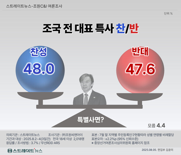 실제 여론조사 결과에 따르면, 광복절 특별사면을 둘러싼 여론은 여전히 팽팽합니다. 뉴스토마토 의뢰로 지난 7월 28~29일 진행된 미디어토마토 조사 결과, 찬성 45.8% vs 반대 45.4%로 큰 차 없이 팽팽하게 나타났습니다. 중도층에서는 반대가 약간 우세한 흐름이었으며, 호남 지역과 40~50대에서는 찬성 여론이 높았습니다. 한편, 스트레이트뉴스 의뢰로 조원씨앤아이에서 실시한 조사에서는 찬성 48.0% vs 반대 47.6%로 역시 오차 범위 내에서 팽팽한 양상이 확인됐습니다.