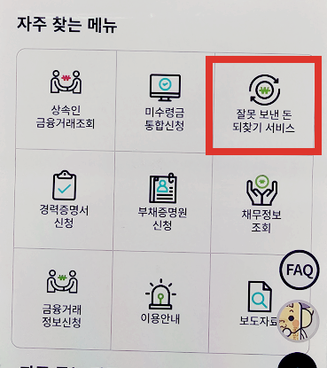 - 앱 첫 화면 → '잘못 보낸 돈 되찾기 서비스' 클릭