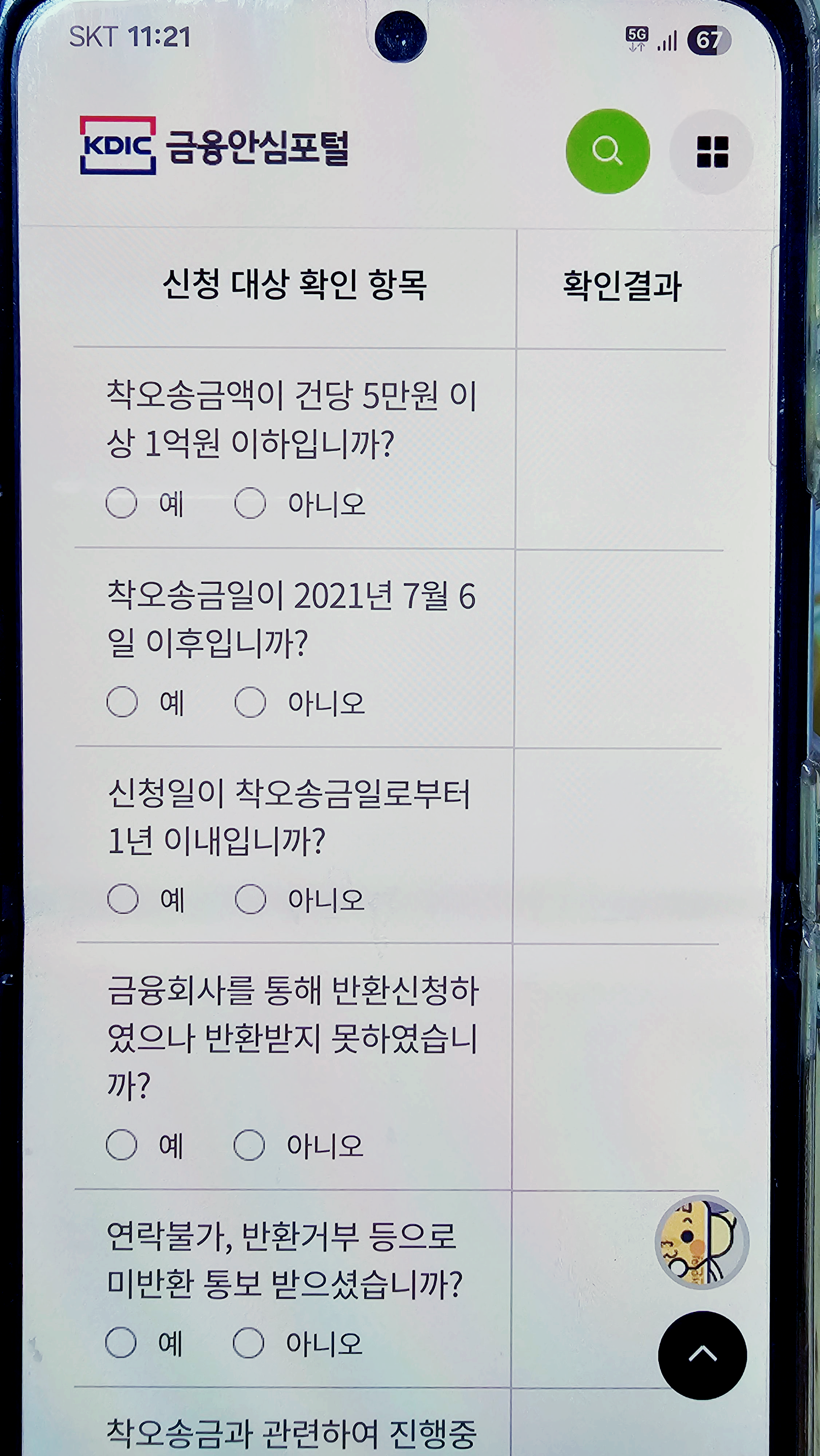 앱을 실행하면 체크박스로 조건을 확인하는 절차가 나옵니다. 총 7개의 항목에 '예'로 체크해야 다음 단계로 넘어갈 수 있습니다.