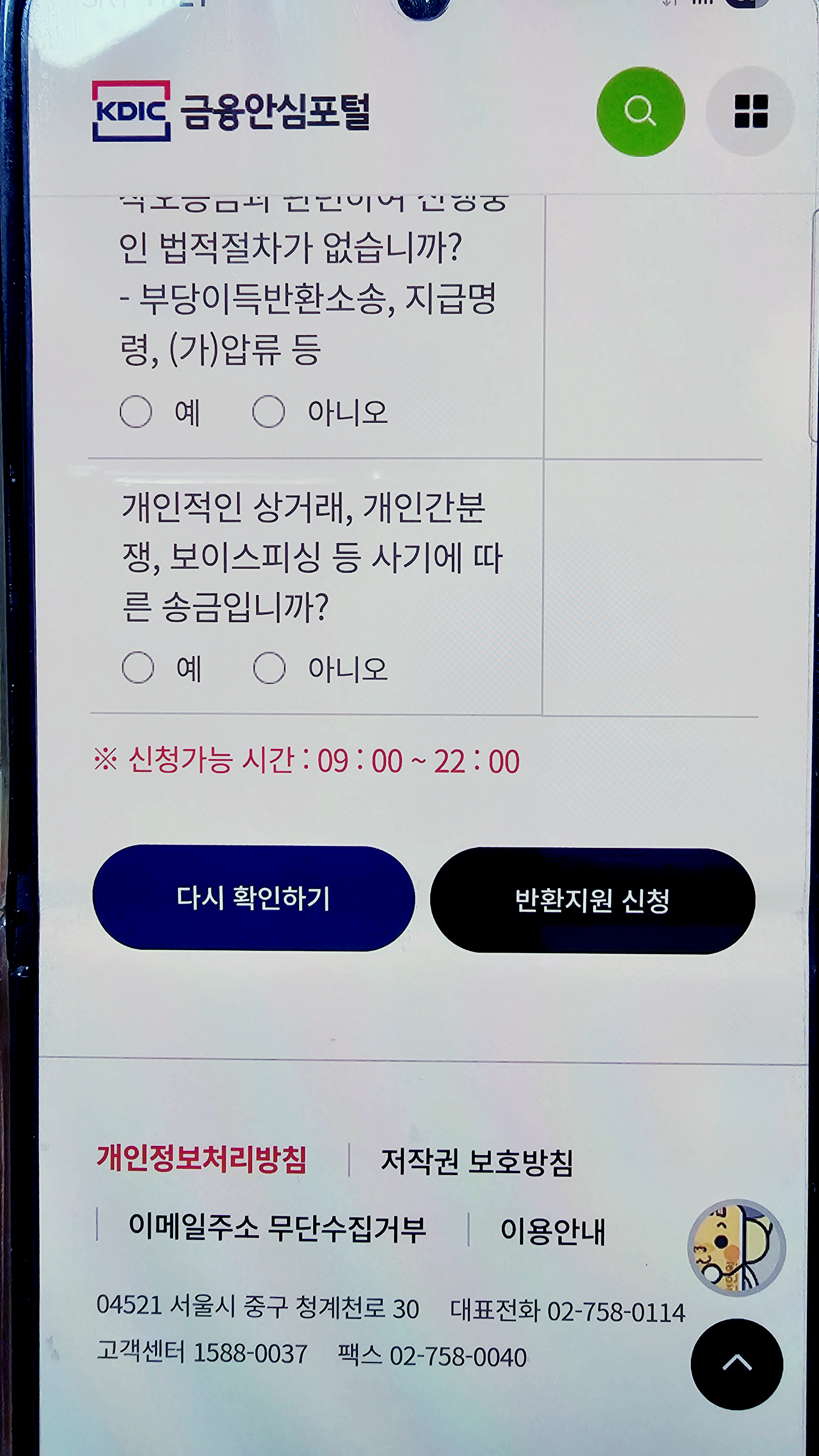 예금보험공사 앱에서 착오송금 반환 신청은 매일 09:00 ~ 22:00 사이에만 가능합니다.