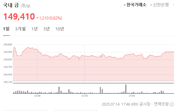 2025년 7월 14일 기준, KRX 금시장 금시세는 1g당 149,410원으로, 전일보다 1,210원(+0.82%) 상승했어요.